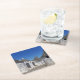 Coaster with traditional white plaster trulli houses with stone tiles in conical roofs in a small street in the town Alberobello, Itria Valley in Puglia, Italy.