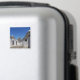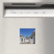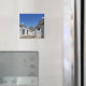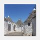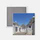 Souvenir photo magnet with traditional white plaster trulli houses with stone tiles in conical roofs in a small street in the town Alberobello, Itria Valley in Puglia, Italy.