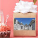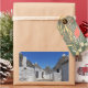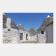 Rectangular photo sticker with traditional white plaster trulli houses with stone tiles in conical roofs in a small street in the town Alberobello, Itria Valley in Puglia, Italy.