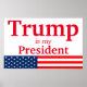 This Donald Trump presidential campaign poster features a white background with the phrase "Trump is my President" printed in white, classic font. The bottom portion of the flag features an image of the American flag.