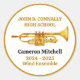 This modern custom gold high school marching band sticker features the student and band name under the trumpet instrument. Customise for symphonic, wind ensemble, or concert band members or their director for a great graduation keepsake gift.