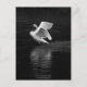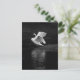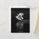 A black and white photograph of a trumpeter swan standing in a shallow spot of a river whilst stretching its wings. The river's current and the reflection of the swan are a lighter colour than the river back-drop, thus creating the illusion of a shape on the surface of the water. Photograph Copyright ©Kimberly J Tilley.
