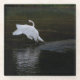 A photograph of a white swan stretching out it's wings whilst wading in a shallow river.
