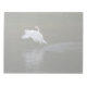 A photograph of a white swan stretching out it's wings whilst wading in a shallow river.