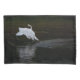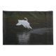 A photograph of a white swan stretching out it's wings whilst wading in a shallow river.