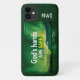 Stylish CHRISTIAN IPHONE CASE with an inspirational quote - GOD'S HANDS ARE SAFE - TRUST IN THE LORD WITH ALL YOUR HEART, which is based on PROVERBS 3:5-6. The design shows a scenic Northern Lights with white and yellow typography. The background is GREEN. The placeholder MONOGRAM at the top corner is CUSTOMIZABLE, so you can personalise with your own details. This would make an ideal gift for Birthdays, Christmas and for anyone who is trusting in the Lord to direct their paths.