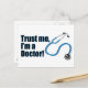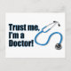 Humourous white postcard with a blue stethoscope design next to the words 'Trust me I'm a Doctor'. It would also be perfect for someone who recently graduated out of Medical School. This item is customisable to allow you to enter someone's name or slogan, just click on the 'customise' button on each product.