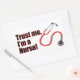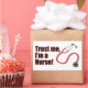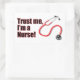 Funny stickers with a red and silver stethoscope graphic beside the words "Trust me I'm a nurse", perfect to hand out at the next nurse's convention! It would also be ideal for someone who recently graduated out of Medical School. Customising: You can choose a different shape, add your own text or images, or resize the current design, by clicking on the ‘Customise it’ button. If you cannot see the product or design you’re looking for, contact us using the ‘contact’ button beneath any product description to discuss your requirements.