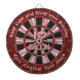 Dark red design bacon dart board. Centre with bacon saying with letters created from bacon strips. Two custom text areas on outer ring.
