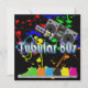 Square pearl shimmer invitation with an image of red, orange, yellow, green and blue paint splatters, high-top sneakers in neon colours, a boom box, cassette tapes, and colourful sunglasses on black. The back is black with a neon blue border and customisable text. See matching envelope, label, square sticker and wrapping paper. See the entire Tubular 80s Invitation collection in the INVITES | Invitations section.