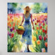 This art print features a watercolor portrait of a woman walking through a field of tulips.