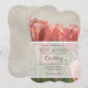 Vertical 5x7 rectangle format with scalloped edges. You can change the edges using the customise it feature. Hand painted artwork by Audrey Jeanne Roberts of a beautiful field of tulips from "The River of Flowers" in Belgium, Holland. Warm coral with blush pink and green over grey distressed wooden fence board background. There are subtle swirl, scroll flourishes over the wood that adds a gentle pattern. A sheer overlay frame in white allows the wood to show through under your typography style wedding invitation text layout. Hand script calligraphy font wording has lovely flourishes that add classy, elegant touches to finish off the design. A complete set is available to match and we can create any product that is available if we haven't yet made it up! Just message us. Copyright, all rights reserved.