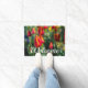 Welcome doormat featuring some beautiful red and yellow tulips in a flower garden. This was a photo I took in Springfield Missouri, United States and turned into a digital art painting which is also known as Mixed Media.