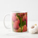 A single deep pink tulip stands out among a field of pink and yellow tulip. Photo taken near Amsterdam, Netherlands.