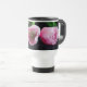 A still life photograph of fresh cut pink tulips, with long green stems, placed down on black fabric. Copyright ©Kimberly J Tilley.