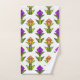 This towel set has an art deco design made from diamonds, triangles, and polygons making tulips in orange and purple with green stems and leaves.