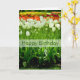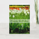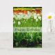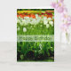 Tulips. This lovely spring birthday greeting card features a gorgeous and colourful tulip photograph with a semi-transparent white banner and "Happy Birthday" text, coloured to match the photo.