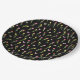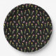 Tulips and butterflies black pattern paper plates. Design features pink, yellow and orange tulips on a black background. Pink and yellow butterflies frolic around the tulips, enhancing the joyful aesthetic with a whimsical touch!