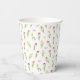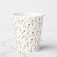 Tulips and butterflies white pattern paper cups. Design features pink, yellow and orange tulips on a white background. Pink and yellow butterflies frolic around the tulips, enhancing the joyful aesthetic with a whimsical touch!