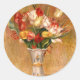 Tulips by Auguste Renoir. Original artwork by French Impressionist artist Pierre-Auguste Renoir (1841-1919). The fine art painting depicts a still life of red, white and yellow tulips in a porcelain vase decorated with yellow flowers.
