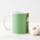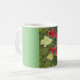 A Classic Mug, with a Picture of Tulips on it, and Light Green Background.