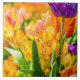 Colourful tulips on a flowerbed. All the rainbow colours present. Bright and positive floral scene. Macro photography.