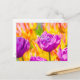Colourful violet, purple, pink tulips on a flowerbed. Virtually all the rainbow colours present. Bright and positive floral scene. Macro photography.
