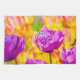Colourful violet, purple, pink tulips on a flowerbed. Virtually all the rainbow colours present. Bright and positive floral scene. Macro photography.