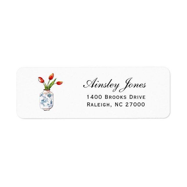 Elegant return address label featuring watercolor illustration of red tulips in a blue and white vase. Matching note card with the same design is available.