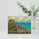 The Mayan ruins of Tulum, Mexico on the Yucatan Peninsula are enhanced by the enticing green-blue water of the Caribbean sea in this vintage travel image.