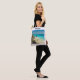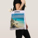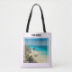 Tote bag with a beautiful photo featuring Tulum, Mexico. Turquoise waters on a sandy shore. Wind swept palm trees blowing in the breeze near a craggy cliff side. Soothing and relaxing.