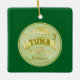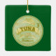 A pop-up style illustration of the lid of a tuna can. This is drawn in vector and has the look of a retro advertising poster. It has tuna fish on it and is drawn in times of green and yellow. A design for anyone who loves canned / tinned fish.