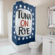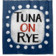 A fun and cute typographic message design that says "Tuna On Rye". It has black and red text on a white rectangle with funky, playful white dots surrounding it, all on a blue background.