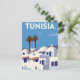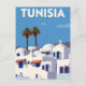 A beautiful and minimalist vintage-style travel poster capturing the classic look of a coastal town in Tunisia. The artwork features the famous white architecture with bright blue doors and windows, two palm trees, and a clear Mediterranean sky. This clean, retro illustration is ideal for those who love North African and Mediterranean travel, collectors of graphic poster art, or anyone who appreciates minimalist, sunny designs.