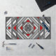 A concentric square mandala takes on the appearance of a tunnel that draws the viewer in with a combination of angled lines, triangles, and circles in shades of grey, red, and white to almost create an optical illusion.