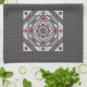 A concentric square mandala takes on the appearance of a tunnel that draws the viewer in with a combination of angled lines, triangles, and circles in shades of grey, red, and white to almost create an optical illusion.