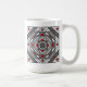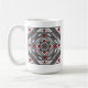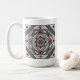 A concentric square mandala takes on the appearance of a tunnel that draws the viewer in with a combination of angled lines, triangles, and circles in shades of grey, red, and white to almost create an optical illusion.