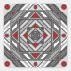 A concentric square mandala takes on the appearance of a tunnel that draws the viewer in with a combination of angled lines, triangles, and circles in shades of grey, red, and white to almost create an optical illusion.