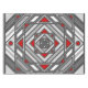 A concentric square mandala takes on the appearance of a tunnel that draws the viewer in with a combination of angled lines, triangles, and circles in shades of grey, red, and white to almost create an optical illusion.