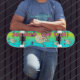 This skateboard has a bolder tie-dye look and features Scratch the Cat, Turdy Boy's best friend.