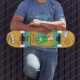 This tie-dyed inspired skateboard features Tom, the owner of the The Tom "A" Chicken Diner, which is the home of Chicken on a Stick and that Special Sauce.