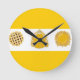 Turkey And Pies Round Wall Clock, by Kristie Hubler, with a cooked turkey, and 2 dessert, pies, pumpkin pie with pastry leaves around the edge, and a lattice berry pie