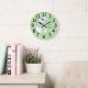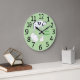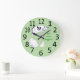 Outline drawings of a turkey, cow, and chicken, with the text, Eat more veggies, are printed on wall clocks. It's a fun reminder to eat more veggies. The background color is light green and can be customized. The clock has large black numbers. Thank you for shopping at CherylsArt on Zazzle.