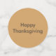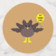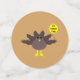 This awesome table confetti features a funny cartoon of a turkey with big black eyes, a small yellow beak and tail feathers sticking up. The feet are facing in opposite directions making the turkey look clumsy. The turkey is holding a yellow balloon with a message inside that says “it’s turkey time”. This is a fun thanksgiving party design.
