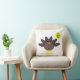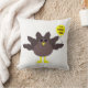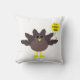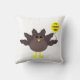 This awesome pillow features a funny cartoon of a turkey with big black eyes, a small yellow beak and tail feathers sticking up. The feet are facing in opposite directions making the turkey look clumsy. The turkey is holding a yellow balloon with a message inside that says “it’s turkey time”. This is a fun thanksgiving party design.