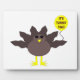 This awesome plaque features a funny cartoon of a turkey with big black eyes, a small yellow beak and tail feathers sticking up. The feet are facing in opposite directions making the turkey look clumsy. The turkey is holding a yellow balloon with a message inside that says “it’s turkey time”. This is a fun thanksgiving party design.