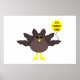 This poster features a funny cartoon of a turkey with big black eyes, a small yellow beak and tail feathers sticking up. The feet are facing in opposite directions making the turkey look clumsy. The turkey is holding a yellow balloon with a message inside that says “it’s turkey time”. This is a fun thanksgiving party design.