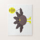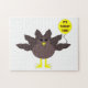 This awesome puzzle features a funny cartoon of a turkey with big black eyes, a small yellow beak and tail feathers sticking up. The feet are facing in opposite directions making the turkey look clumsy. The turkey is holding a yellow balloon with a message inside that says “it’s turkey time”. This is a fun thanksgiving party design.