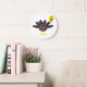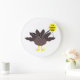 This awesome clock features a funny cartoon of a turkey with big black eyes, a small yellow beak and tail feathers sticking up. The feet are facing in opposite directions making the turkey look clumsy. The turkey is holding a yellow balloon with a message inside that says “it’s turkey time”. This is a fun thanksgiving party design.