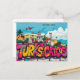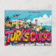 Postcard from the Turks and Caicos Islands, UK! This postcard in graffiti style features an a big Turks & Caicos script in yellow pink, in front of the abstract island with its buildings and the sky.